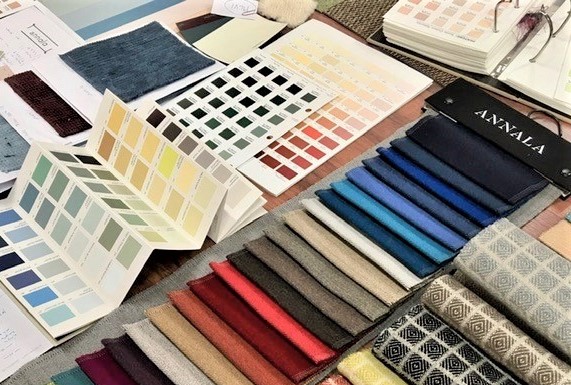 Valitse värit esim. Annalan Kehrä- tai Ajatar-kankaan värikartasta. Voit myös käyttää Pantone-, RAL- tai vastaavaa värikarttaa.