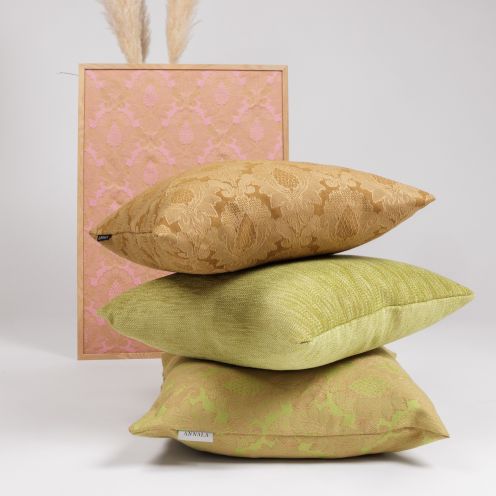 Perinteikäs Colmarin ornamenttikuvio soveltuu hyvin yhdisteltäväksi yksiväristen Ajatar-tyynyjen kanssa, sillä sieltä löytyvät samat samettiset värisävyt.
